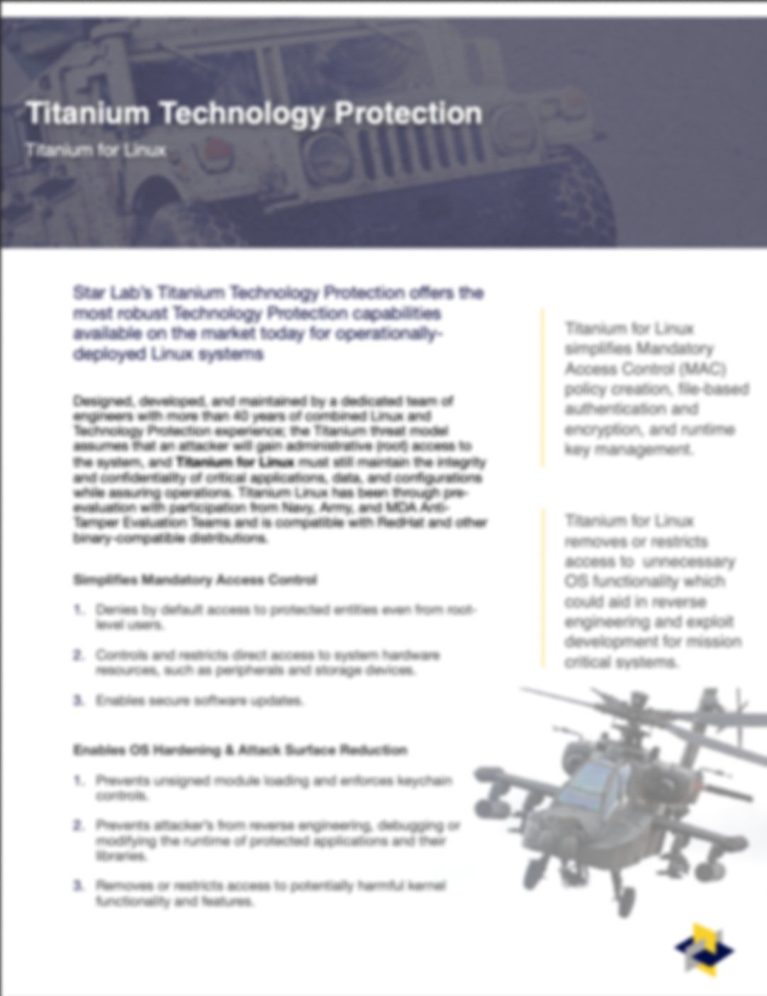 Star Lab’s Titanium Technology Protection offers the most robust Linux system-hardening and security capabilities available on the market today for operationally-deployed Linux systems. Designed using a threat model that assumes an attacker will gain root (admin) access to your system, Titanium for Linux maintains the integrity and confidentiality of critical data and configurations while assuring operations. It also enables customers to rapidly and affordably address the majority of their technical IA / cybersecurity controls with a single product.